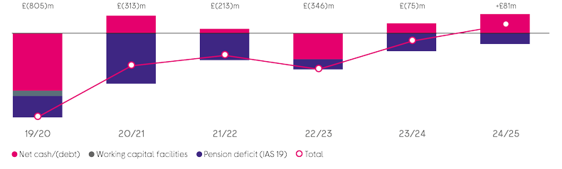The last five years have seen a significant improvement to the Group’s balance sheet as indebtedness excluding lease liabilities has improved from £(805)m deficit to a surplus of +£81m. The Group intends to remain in a healthy net cash position, even as the pension deficit continues to reduce, but does not need any further cash on the balance sheet.